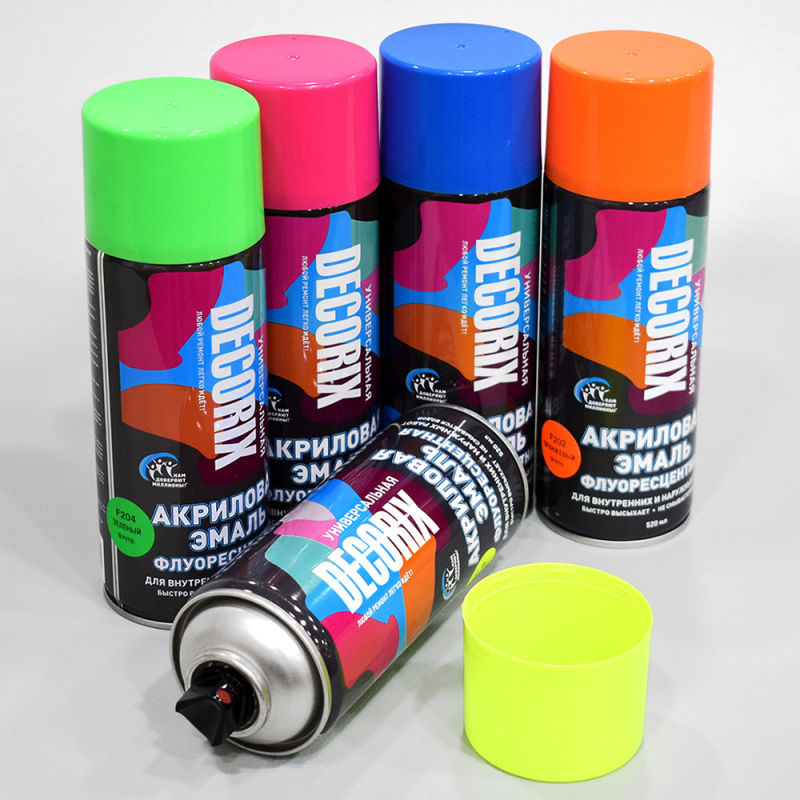 Высококачественная универсальная акриловая эмаль с флуоресцентным эффектом DECORIX используется в декоративно-оформительских работах, строительстве и ремонте.