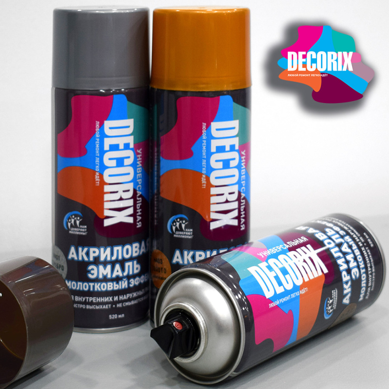 Высококачественная универсальная акриловая эмаль DECORIX с молотковым эффектом используется в декоративно-оформительских работах, строительстве и ремонте.