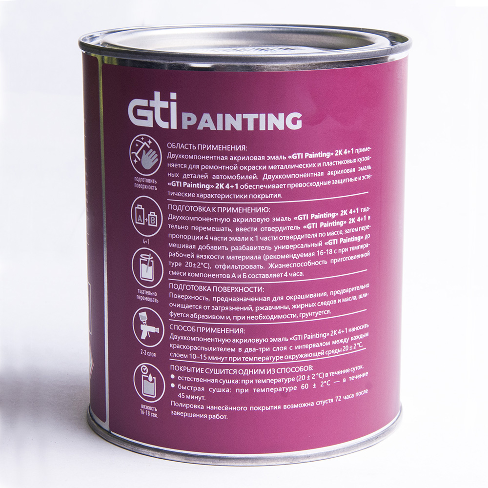 Двухкомпонентная акриловая эмаль "GTI Painting" 2К 4+1 применяется для ремонтной окраски металлических и пластиковых кузовных деталей автомобилей.
