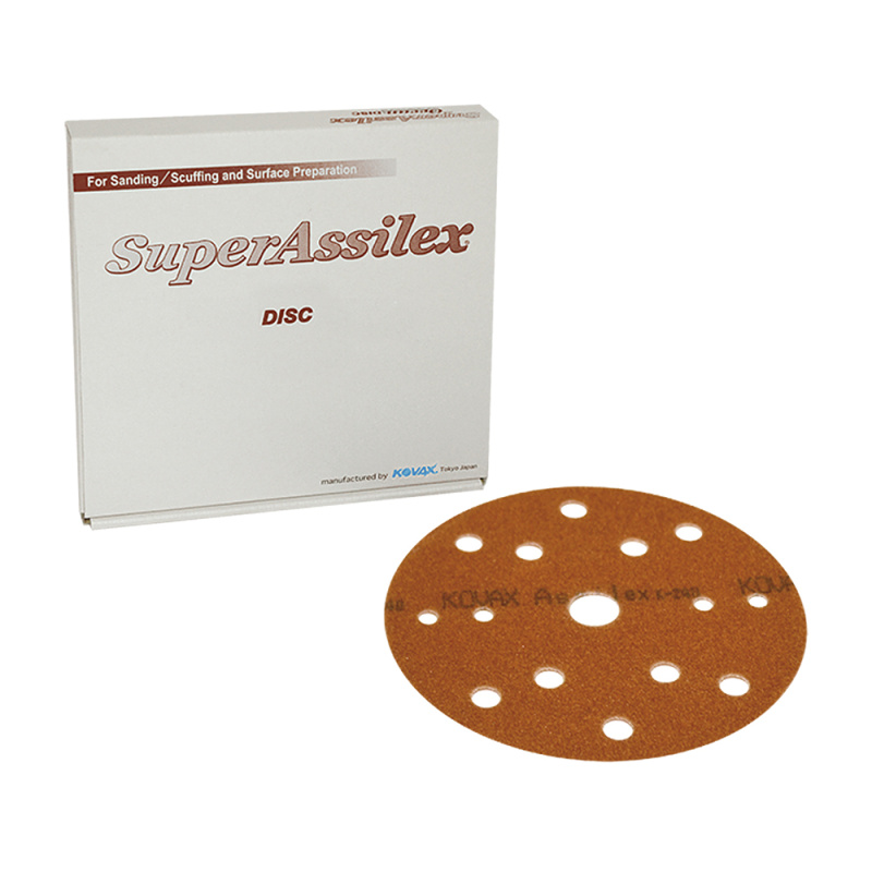 Абразивные круги, листы Super Assilex и Assilex (7 отв., 15 отв.), зернистостью от P240 до P1500 – инновационный, не имеющий аналогов абразивный материал для матирования поверхности, обработки грунта, лака. Обеспечивает исключительно ровную, однородную риску, позволяет легко обрабатывать твёрдые лаки и грунты (особенно эффективен для обработки твёрдых лаков Super assilex orange P1500). Материал работает без применения воды, матирующей пасты или геля, приблизительный расход - 1 лист (круг) на 2-4 детали, применяется с мягкими подложками. Незаменим при ремонтной окраске методом «перехода». Листы, благодаря своей супер-гибкой основе удобны при обработке поверхностей и профилей сложной формы. Использование данных материалов на различных этапах позволяет сэкономить трудозатраты на 50 и более процентов.