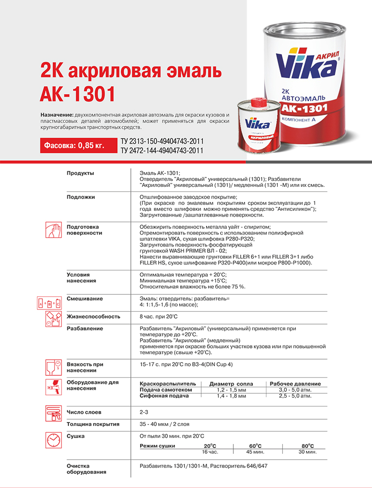 Разбавитель 1301 (стандартный) применяется при температуре до +20ОС. Разбавитель 1301М (медленный) применяется при окраске больших участках кузова или при повышенной температуре (свыше +20ОС). Разбавители 1301 и 1301М можно смешивать в различных пропорциях.