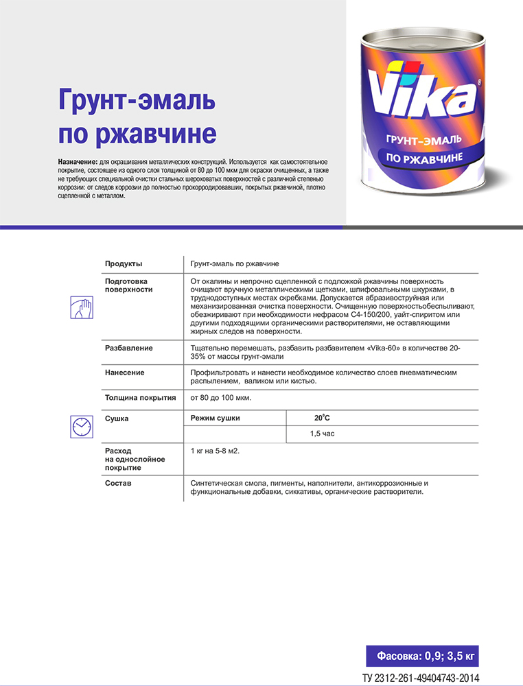 Возможно нанесение Грунт-эмали VIKA по ржавчине в один слой толщиной 80-100 мкмпневматикой, кистью, валиком благодаря тиксотропной консистенции. Не требует тщательной зачистки металла от ржавчины и дополнительного нанесения защитных материалов.